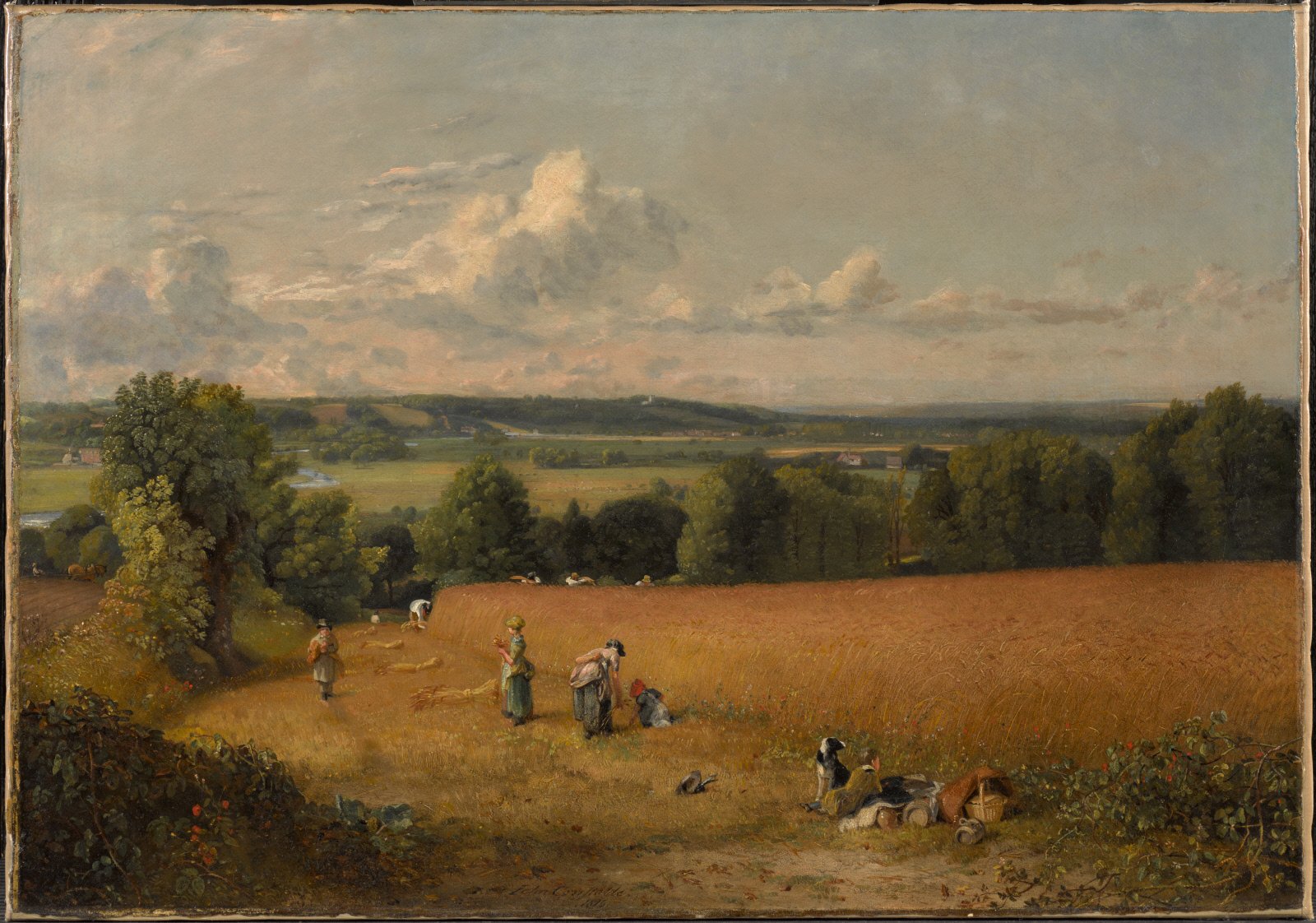 gaze, from the boy at the stream, to the man reaping the corn and finally, to